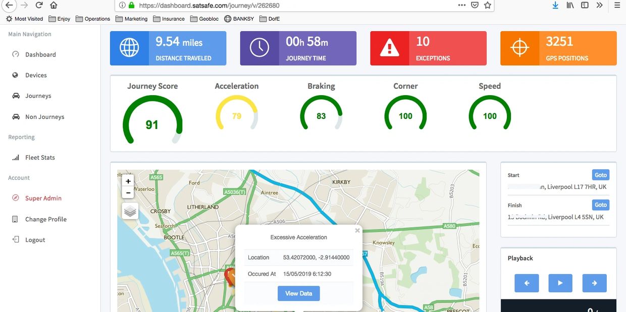 The SATSAFE platform provides access to each and every journey in great detail. For insurers, this is extremely valuable data as it is useful to determine whether one of their insured drivers is driving more eraticaly than their peer group and therefore, potentially exposing them to more risk of being involved in a collision. We also have a leader board showing each driver's overall scores compared with others.